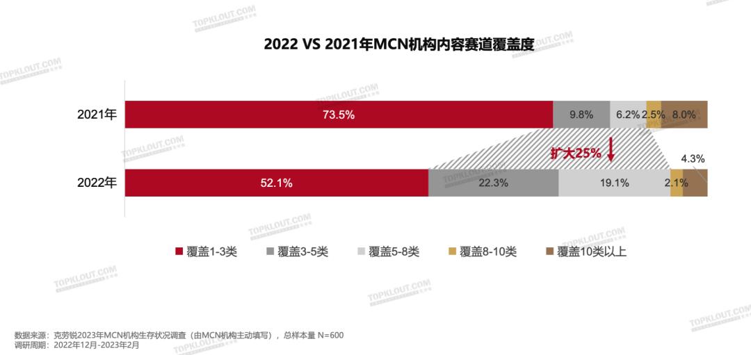 与此同时,大家纷纷投注更多的品类,寻求第二条增长曲线:可以看到,2022年MCN有41.4%机构覆盖3-8类内容赛道,而2021年是16%。