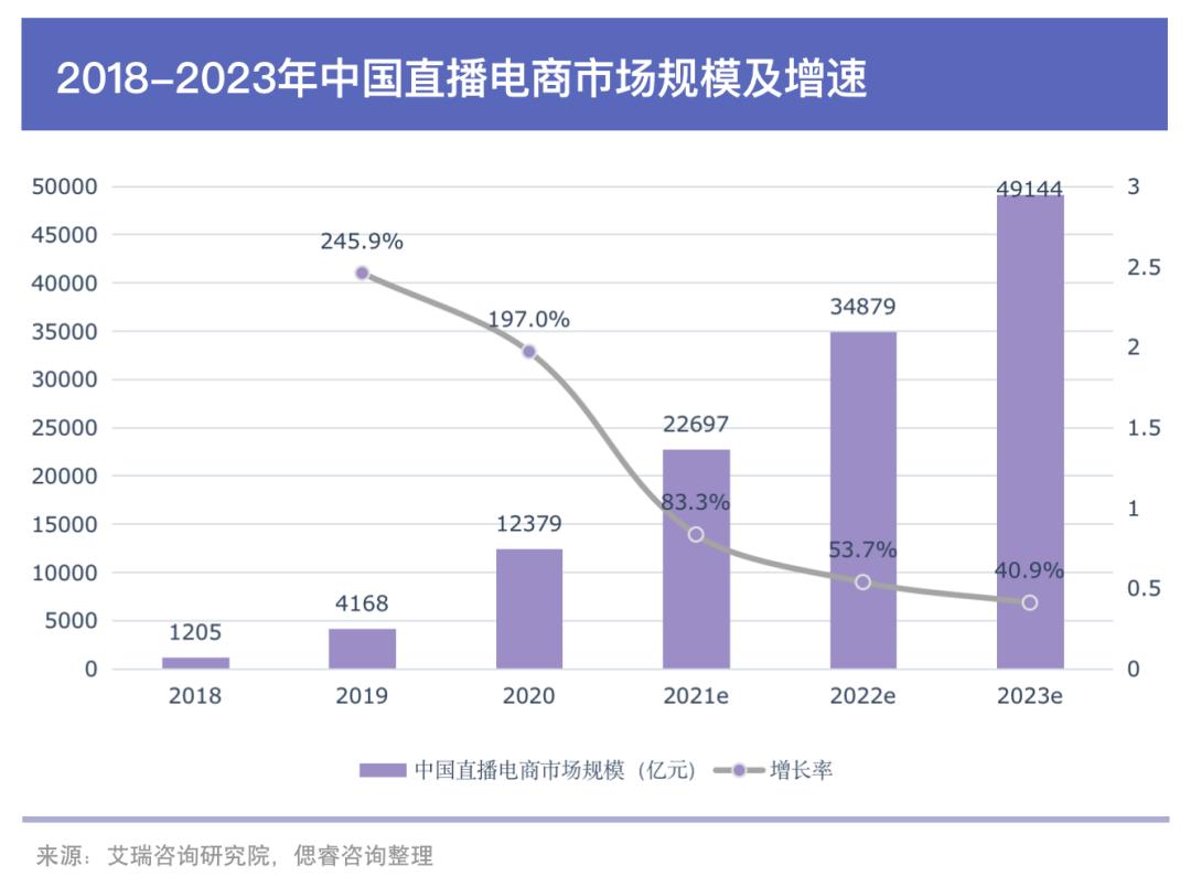 据艾瑞咨询发布的《2021年中国直播电商行业研究报告》,2020年中国直播电商市场规模超1.2万亿元,年增长率高达197%,预计2023年直播电商规模将超过4.9万亿元。