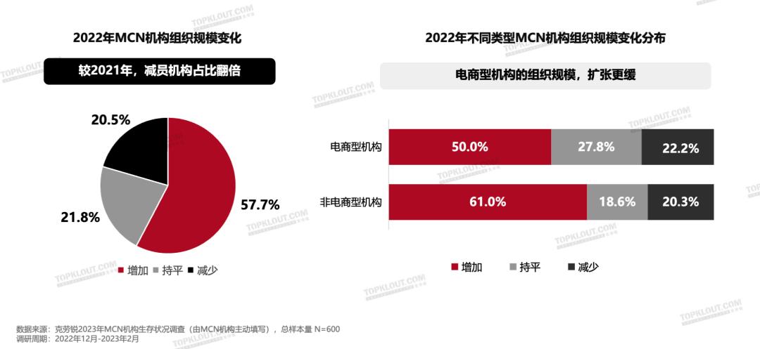 新注册量在狂飙,但现有机构正向内收敛:为降本增效,MCN机构开始控制组织规模,超4成机构在2022年未进行扩张,且电商型机构相较非电商型机构扩张更慢。