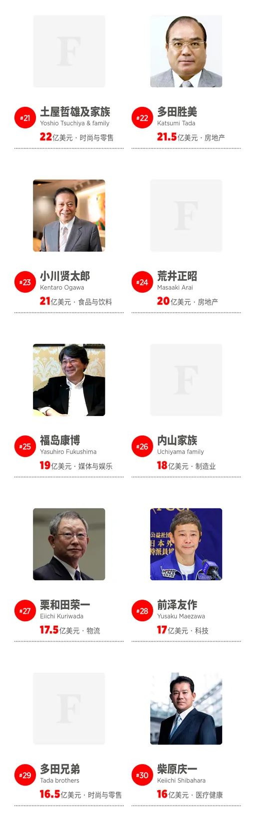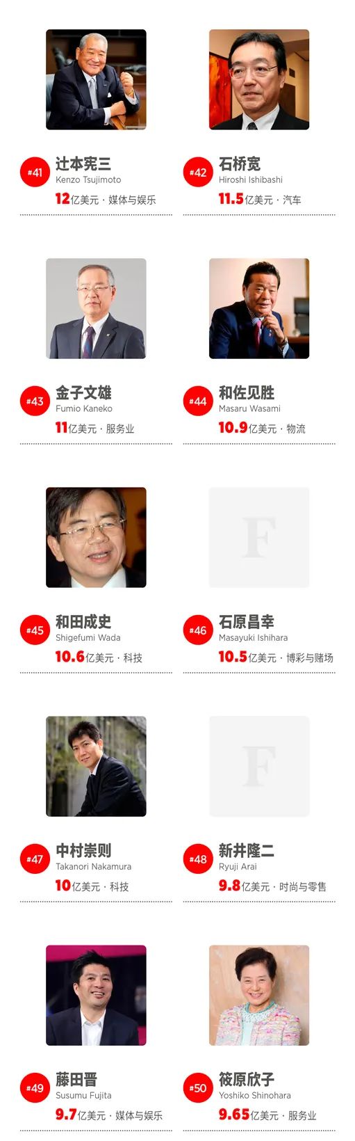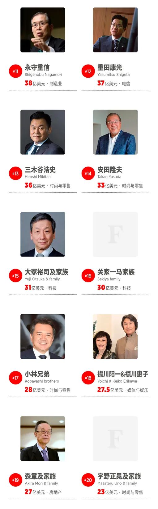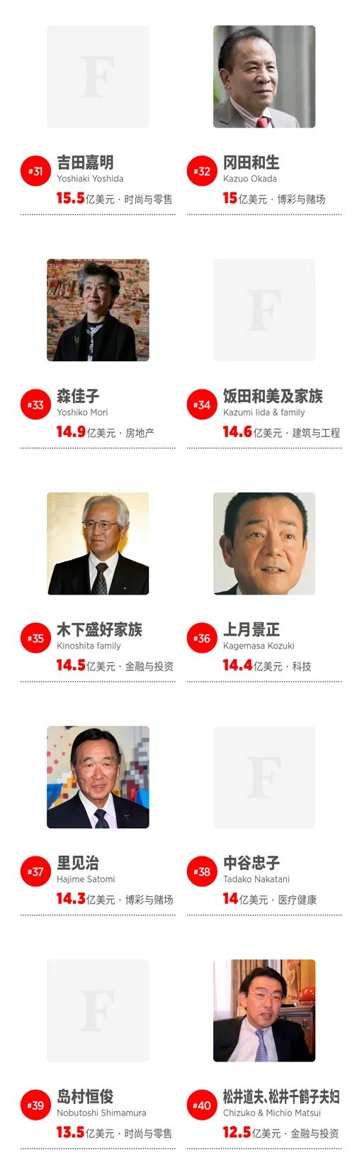 今年的榜单有三位新人:创立并经营视频游戏公司卡普空 (Capcom) 、拥有美国加州Kenzo Estate酒庄的辻本宪三 (Kenzo Tsujimoto,身家12亿美元) ,以及废弃物管理公司大栄环境株式会社 (Daiei Kankyo) 的联合创始人兼总裁金子文雄 (Fumio Kaneko,身家11亿美元) 。伊藤兄弟姐妹 (身家47亿美元) 在继承了他们的父亲伊藤俊雅 (Masatoshi Ito) 的7-11零售帝国后首次上榜。伊藤俊雅于今年3月去世,享年98岁。