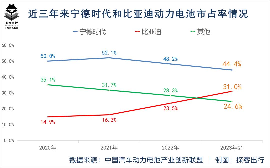 「探客出行」从中国汽车动力电池产业创新联盟获悉,2023年Q1宁德时代动力电池市场占有率约44.4%,相比于2022年下降3.8个百分点。
