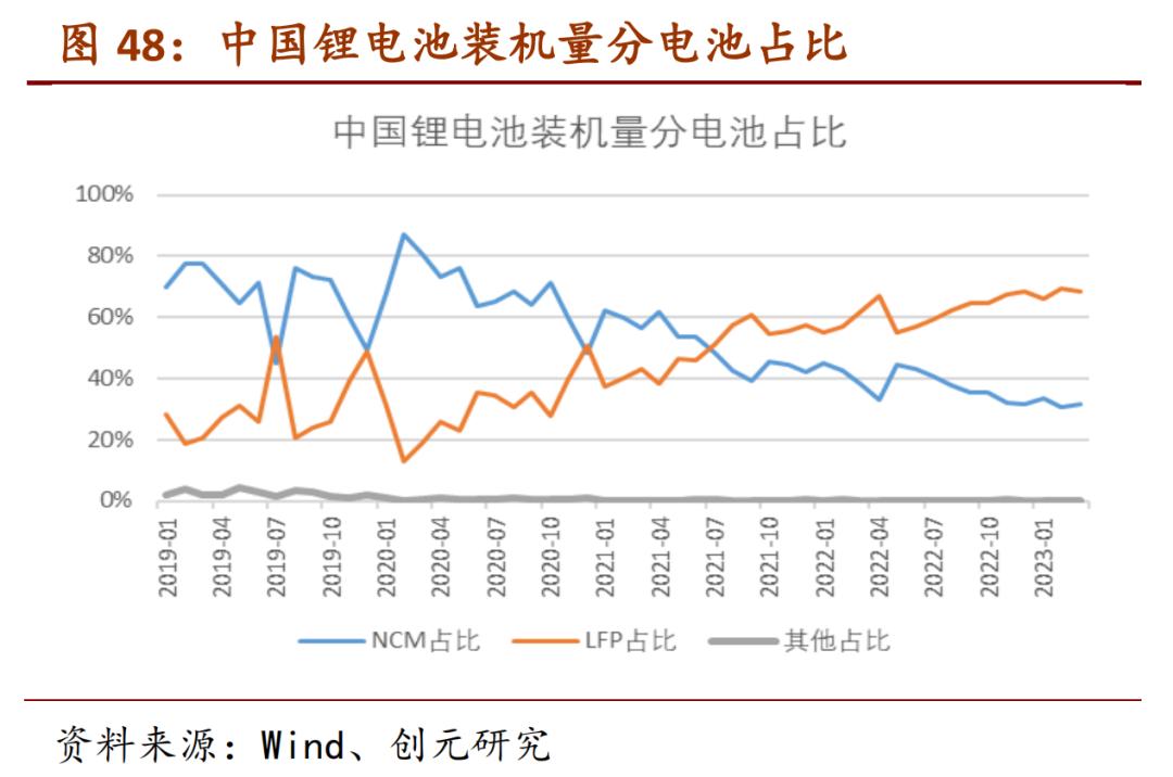 数据显示:中国锂电池装机量在2019年初还是以NCM材料为主,且占比超七成。2021年,NCM和LFP材料的占比出现了“五五分”,到了2023年初,LFP材料电池对NCM材料实现了逆转,且基本稳在了70%的市场份额。