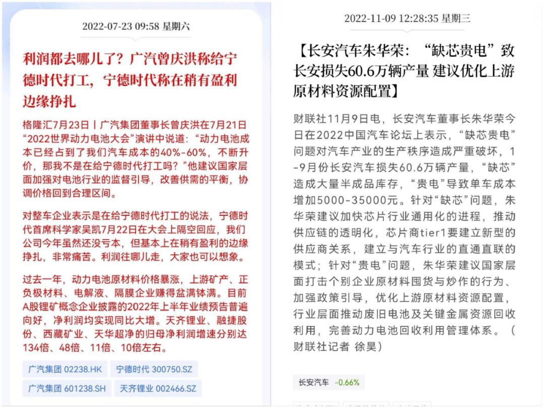2022年7月,广汽集团董事长曾庆洪吐槽道,动力电池成本已经占到汽车成本的40%—60%,在给宁德时代打工,并建议国家层面加强对电池行业的监督和引导。
