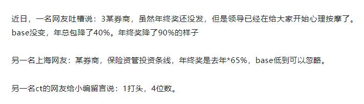 类似的自媒体爆料还有很多:3某券商,年终奖降了90%;某券商保险资管投资条线,年终奖是去年的65%;某券商年终奖“1打头,4位数”。