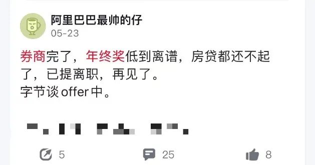 脉脉上,有券商民工称:券商完了,年终奖低到离谱,房贷都还不起了,已提离职,再见了。