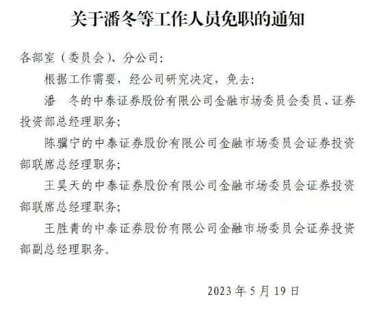 更有截图显示,中泰证券于5月19日下发人事任免文件,免去金融市场委员会四位负责人职务,为自营条线下的证券投资部门。