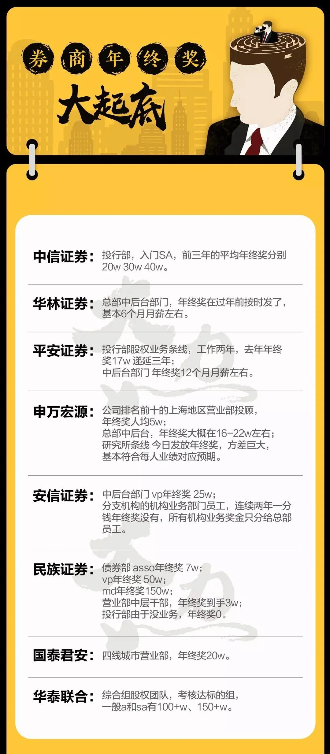 从这份盘点中可以看出,在金融圈,券商的年终奖也存在“二八效应”,即头部券商总部的前台,即业务部门的年终奖遥遥领先,总部的其他部门和中小券商、地方营业部的年终奖则差了很多,有的甚至没有年终奖。