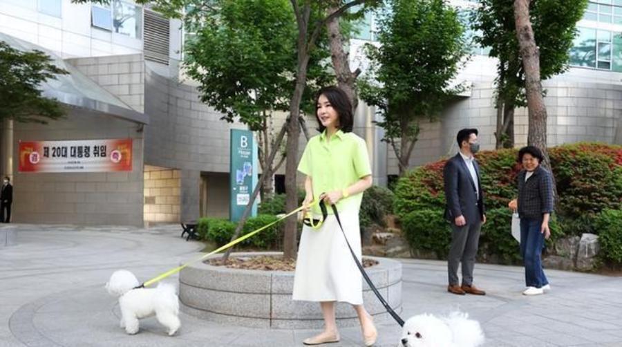 韩国“最美第一夫人”金建希牵着自己的宠物狗