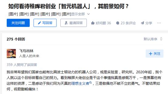 关于稚晖君做AI机器人创业一事,在知乎有一个关于“如何看待稚晖君创业智元机器人,其前景如何?”的问题板块,不少专业人士对此事从态度和专业的角度分别发表了各自的看法。