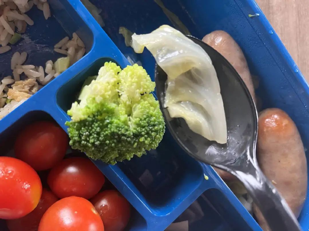 巴掌大的炒饭、三根水煮西兰花、6、7个圣女果、三根肉肠,外加一个被压变形的小蒸包,主打的就是平平淡淡但五颜六色。