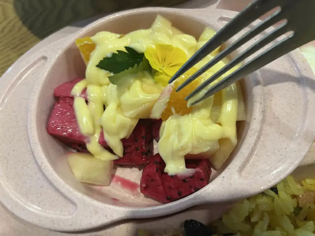 火龙果橙子蜜瓜三种切块上面又铺上厚重的沙拉酱。无油无盐的煮蛋做得像慕斯,还让我兴奋了一下。