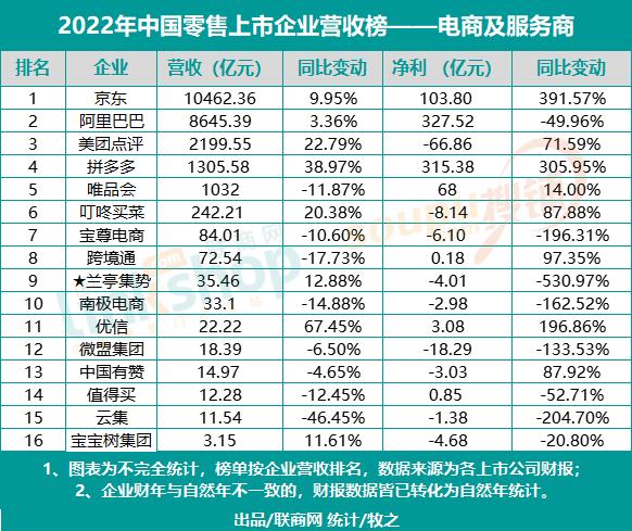从2022年业绩来看,阿里、京东、美团、拼多多和唯品会五大头部企业,占领绝大部分电商份额。其中,营收占比高达97.73%;净利润占比从2021年的105.53%上升为2022年的106.33%。