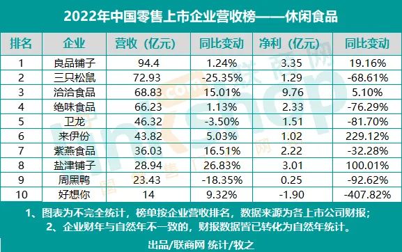 10家企业中有9家企业都实现了盈利,其中,恰恰食品盈利最高(9.76亿元),良品铺子其次(3.35亿元),盐津铺子第三(3.01亿元),而周黑鸭只有2500万元的净利润。但从净利润增幅来看,来伊份增幅最大(229.12%),盐津铺子其次(100.01%)。只有好想你实现亏损,亏损额达1.9亿元。