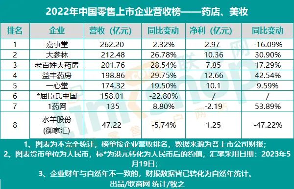 近几年,药店、美妆行业业绩表现都非常出色。2022年8家可比药妆上市企业实现营收1389.85亿元,同比增长11.16%;实现净利润(不含屈臣氏)43亿元,同比增长27.03%。
