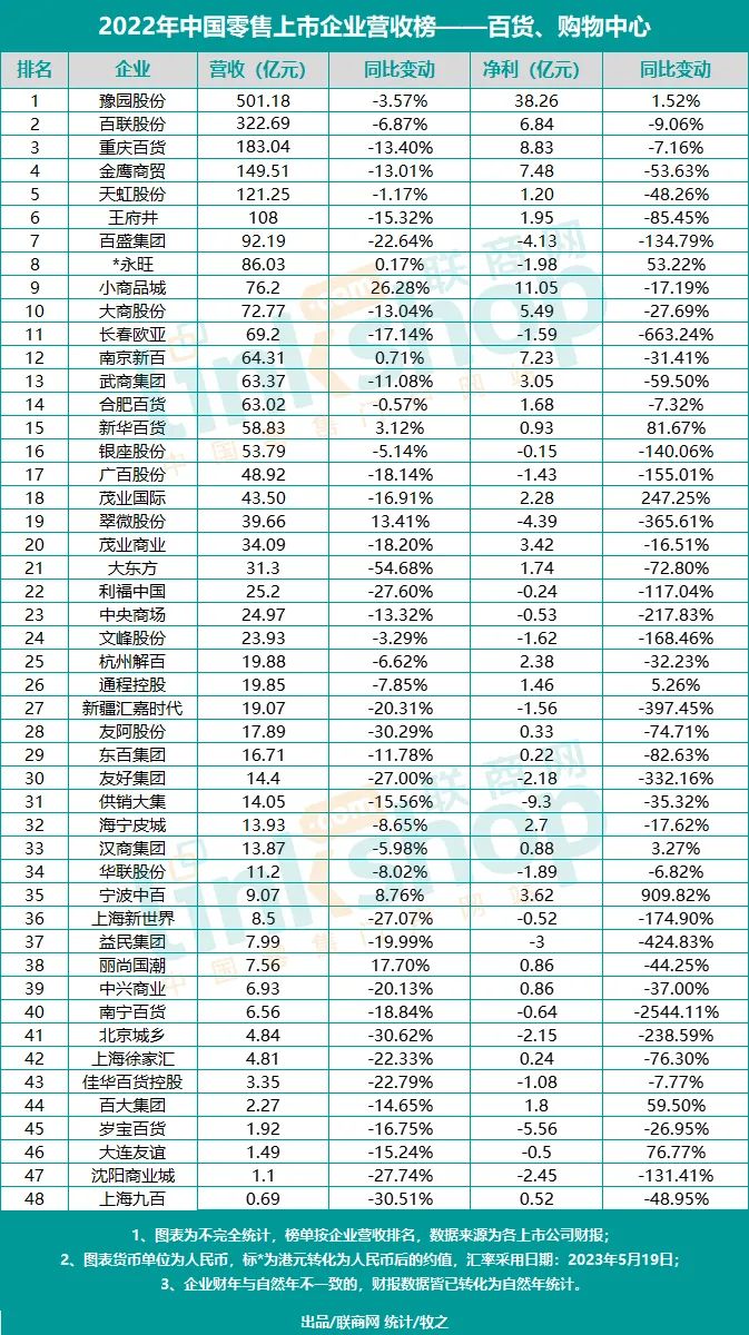 据联商网零售研究中心统计,48家百货、购物中心上市企业2022年实现营收2584.88亿元,同比下降12.14%,实现净利润70.41亿元,同比下降46.66%。