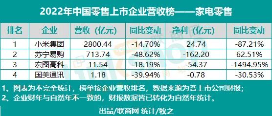 2022年,4家家电零售企业实现营收3526.9亿元,同比下降24.78%;实现净利润-192.61亿元,同比减亏50.46亿元。在家电上市公司中,只有小米盈利,其他都在亏损。