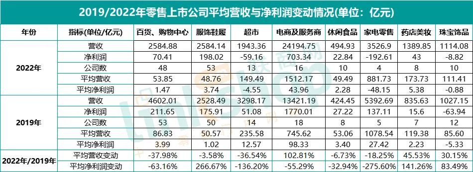 在8个可比行业中,百货购物中心、超市、休闲食品、家电零售等四个业态的上市公司的平均营收与平均净利润双双下跌;药店美妆和珠宝饰品两个业态则双双增长,其中药店美妆业态平均营收与平均净利润分别增长45.53%和141.26%;服饰鞋履业态的平均营收微弱下跌,平均净利润大增266.67%;电商与服务商业态则是平均营收增长,平均净利润下降。如下表所示: