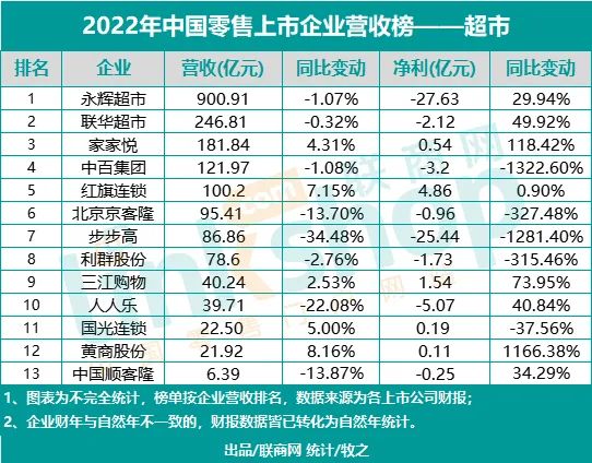 据联商网零售研究中心统计,13家超市上市企业有8家出现营收同比下滑,其中包括永辉、联华、中百等头部企业,步步高降幅最大,同比下降34.48%。