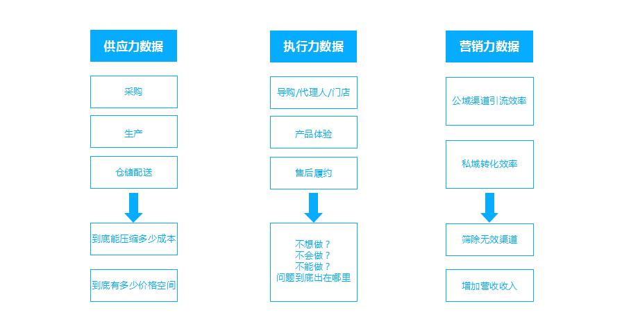 而数字化系统则对应着数字化管理与数据分析的巨大需求,即我们前面讲到的供应力数据、执行力数据和营销力数据。