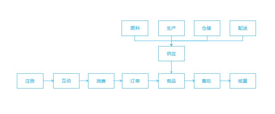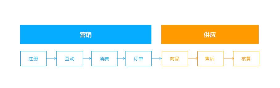 首先,我们来看一下完整的商业链路包括哪些环节,这里可以分为前端的营销和后端的供应两大方面。