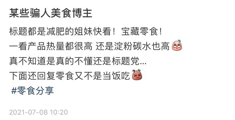 其中,针对不少零食博主主推的低卡低糖零食,就有网友吐槽道,“现在好多零食博主主打一个低卡、减脂和健康,但一看配料表就知道热量并不低,就连曲奇和威化饼干都能被有的博主说成减脂期零食,不得不服。”