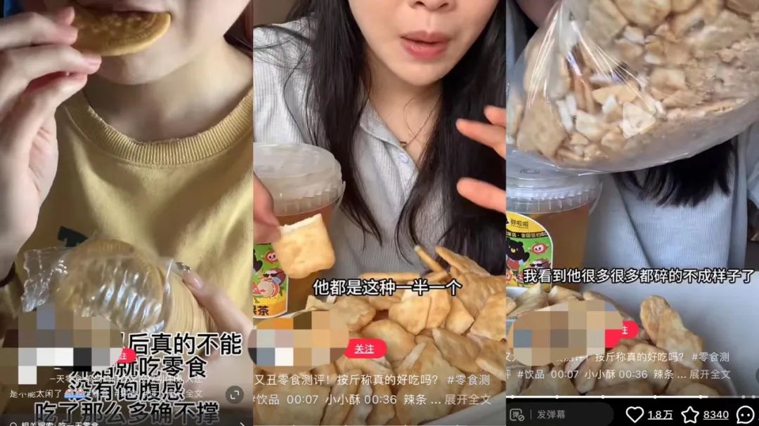 此外,大部分博主对零食的评价文案也趋于同质,而这也引起不少网友吐槽道,“一点开零食吃播,短短三分钟一定能听到的词语包括糯叽叽、哽啾啾、绝了、能拉丝、求求别停产……形容词也过于贫瘠。”