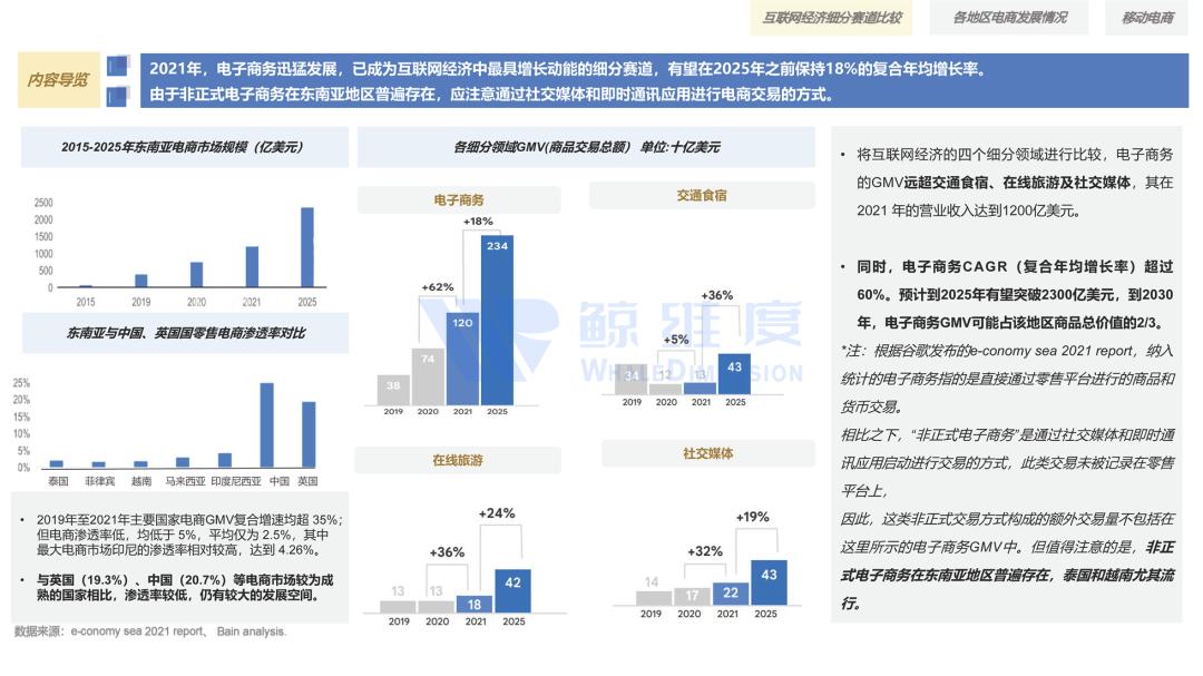 东南亚地区互联网经济整体交易总额和主要国家单独交易总额都能保持2021年的高速增长趋势,在2025年实现两位数的复合年均增长率。