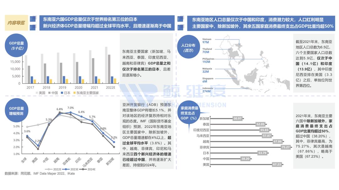 近年来,东南亚地区经济发展强劲,东南亚六国GDP总量仅次于世界排名第三位的日本,地区内新兴经济体GDP总量增幅均超过全球平均水平,且增速逐渐高于中国,未来经济增速位居世界前列,随着人口不断增长,居民消费逐渐成为经济活动中重要的增速动力。