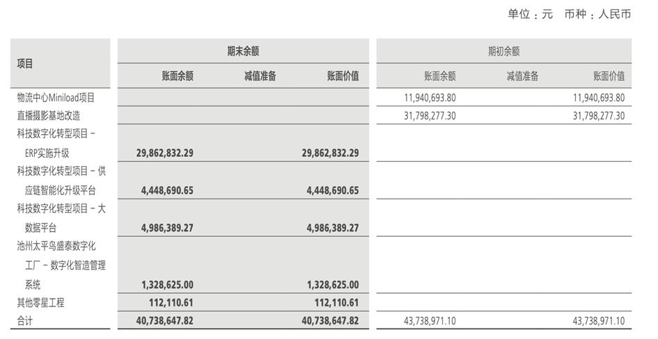 2022年报显示,太平鸟有包括ERP升级、供应链智能化升级、大数据平台、池州数字化工厂等在建工程项目,合计4074万元。作为对比,去年太平鸟回购股份就花了约6582万元。