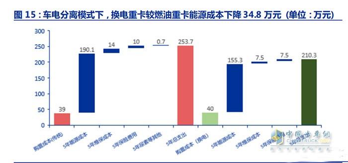 若按照燃油重卡百公里油耗40L/100km和换电重卡电耗160kWh/100km测算。在采用车电分离模式下换电重卡5年能源成本5年总支出210.3万元,较传统重卡5年总支出253.7万元下降43.4万元。