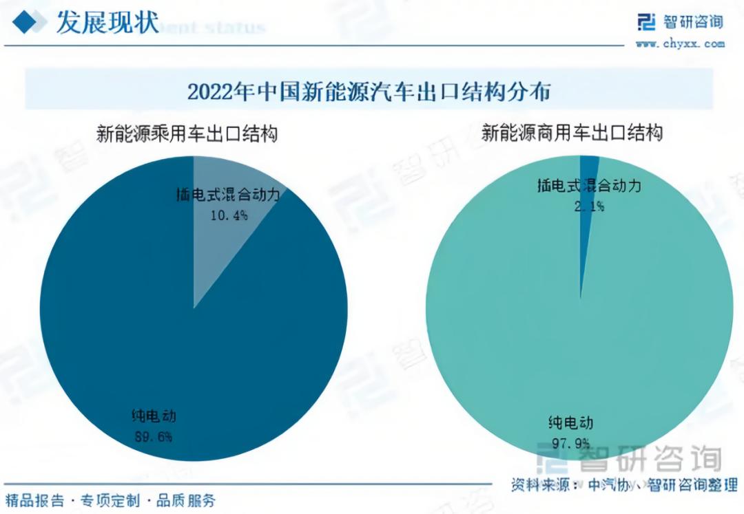 从2022年出口结构来看,新能源乘用车与商用车领域,纯电动车型均占据主导地位,主要由于欧洲等国家对环保要求更为严格,而纯电动汽车环保性能更优。