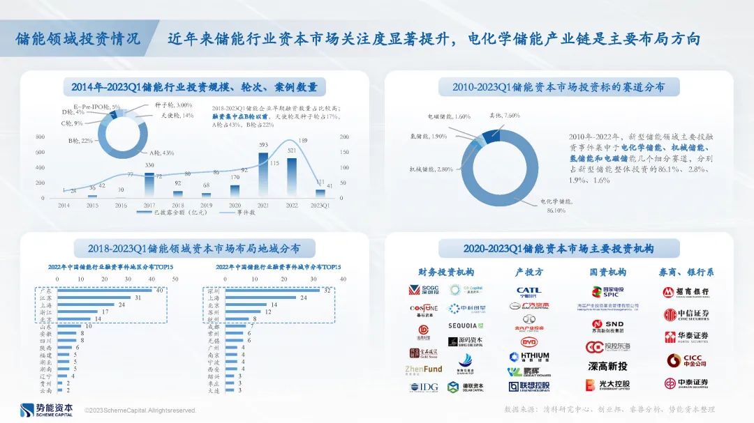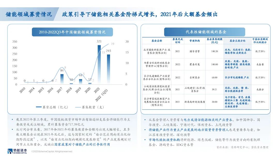 随着国家政策向新能源领域倾斜,我国储能领域的新设立基金数量及规模显著提升,投资端项目案例数量明显增多;同时,我国电力机制存在地域特色,各地区均存在代表性的储能厂商。