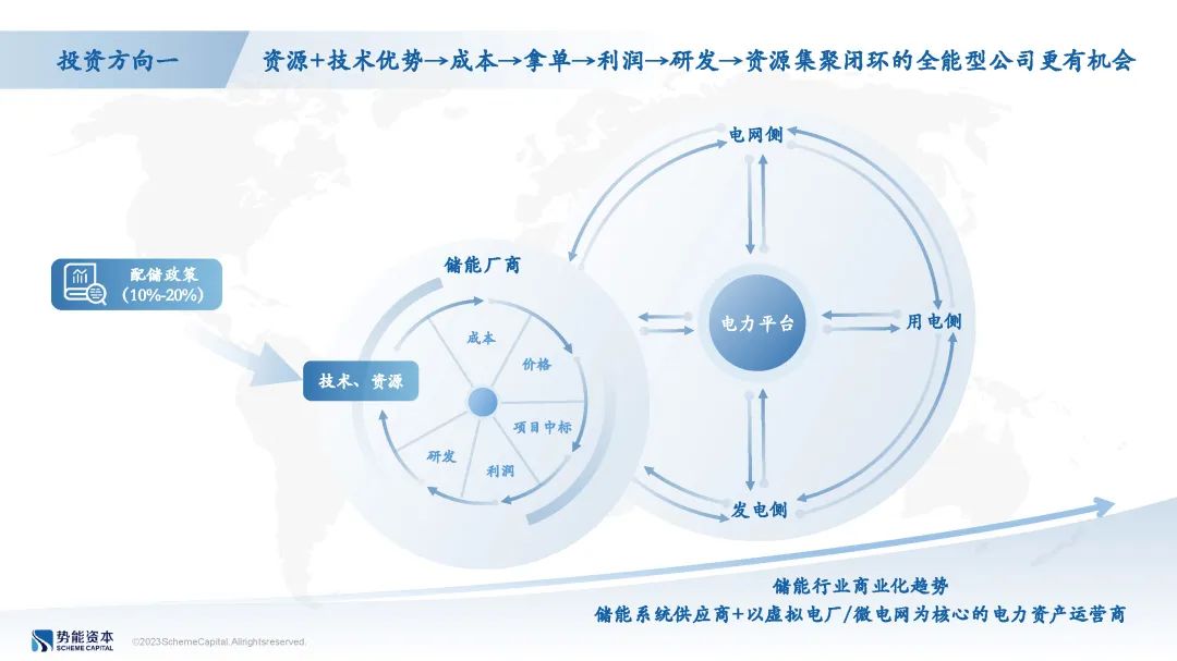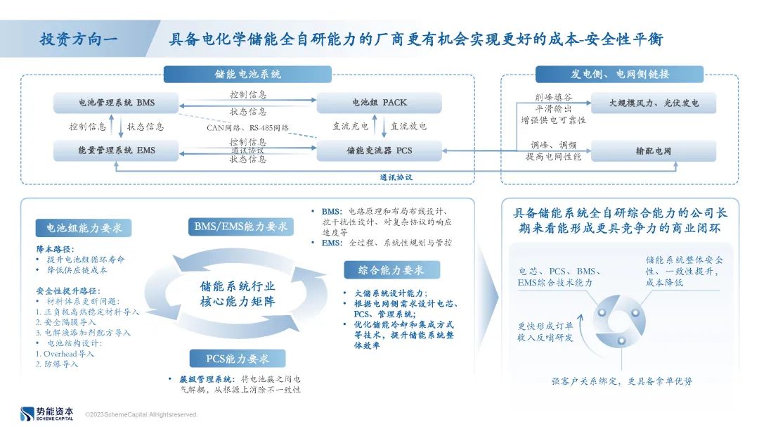 电化学储能产业链核心环节包含电芯、PCS、BMS、EMS,当前储能领域各环节已经形成了一定程度区隔的状态,例如做PCS的厂商不涉及电芯业务,一些自研电芯的厂商也从主流厂商采购PCS。但是由于电化学储能各环节需要协同工作以实现更高的安全性和经济性平衡,因此具备全自研能力的电化学储能厂商长期来看将可能形成从技术、资源到利润聚集、持续研发的商业闭环,并在远期联合各类型终端用户形成规模化电力平台综合运营业务模式。