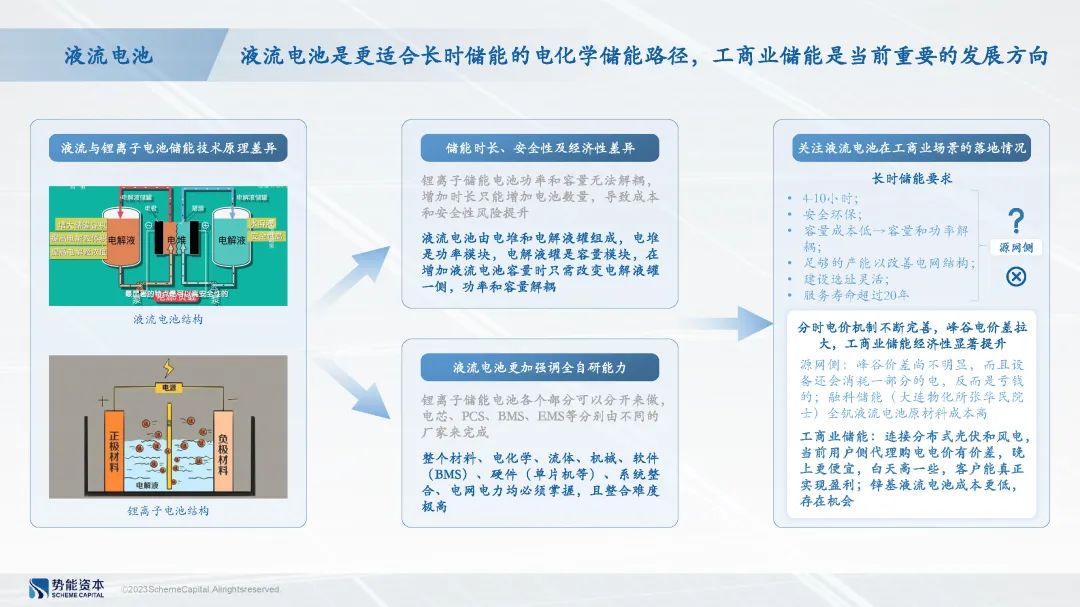长时储能技术是未来大储领域调峰、工商业用户调节电力供应的重要保障,重点关注液流电池方向。 从结构原理上看,区别于锂离子电池,液流电池的容量和功率解耦,通过增加低成本电解液的方式为液流电池扩容不会显著影响其安全性,相较于锂离子电池能更好地适应长时储能的需求。目前全钒液流电池已经实现源网侧项目落地,锌基液流电池成本更低,未来有望在源网侧及用户侧不断渗透。
