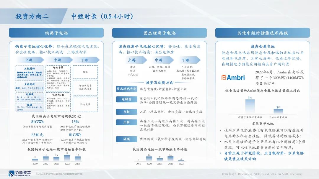 中短时长储能领域重点关注钠离子电池及固态锂离子电池方向, 原材料储量的丰富性使得钠离子电池成本显著低于锂离子电池,关注具备上游环节自研能力的厂商;固态锂离子电池较液态、半固态锂离子电池的安全性、能量密度更高,关注具备固态电解质自研能力的厂商。