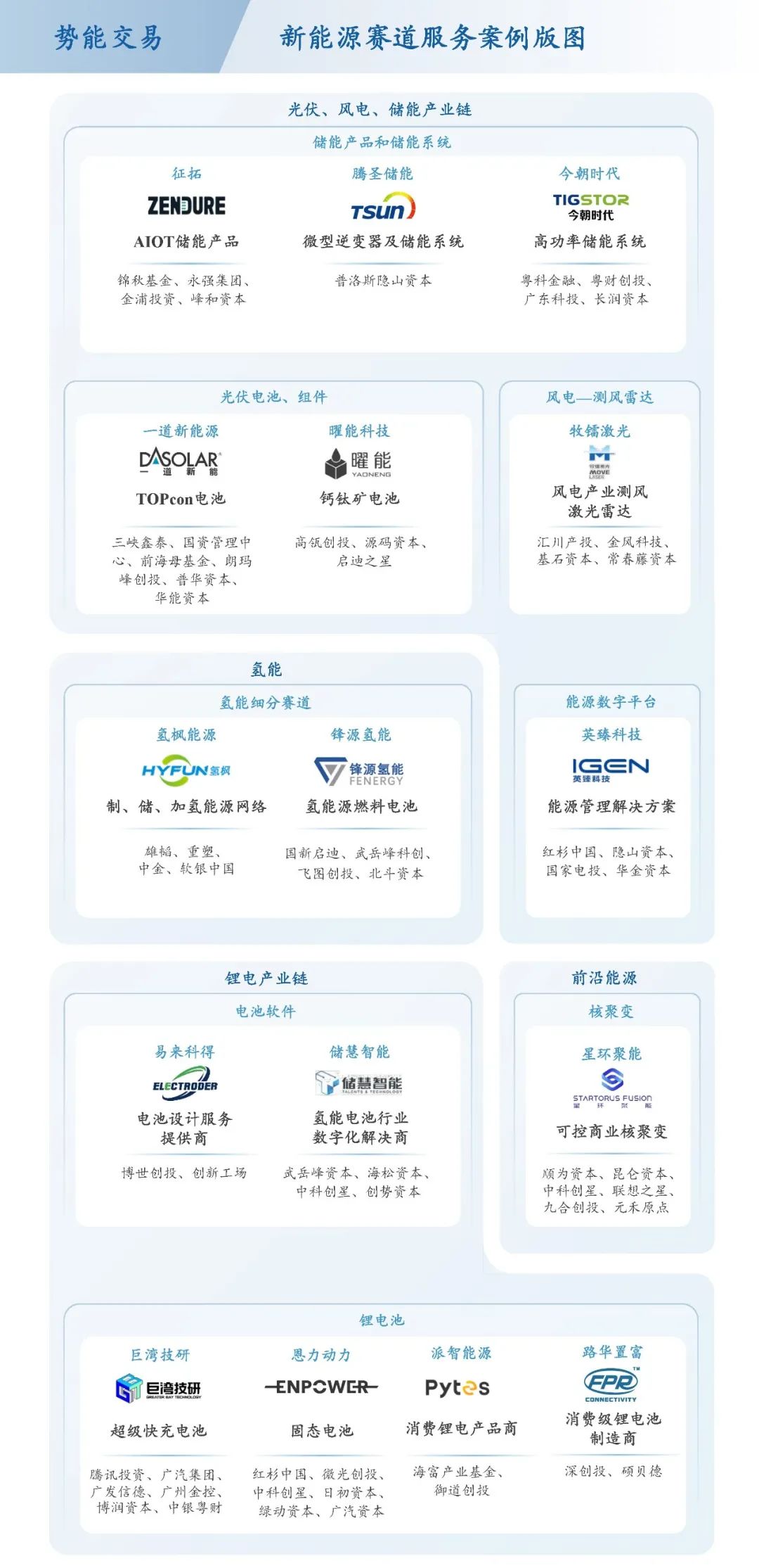 势能资本高度关注碳中和、新能源领域的交易机会,已经重点布局储能产品及储能系统、能源数字平台、氢储能、核聚变等前沿能源、电化学管理软件、锂离子电池产业链等环节。储能领域是势能重点覆盖的赛道,希望能在充满机遇的储能赛道找到顶尖的技术厂商,帮助国内储能企业不断成长。