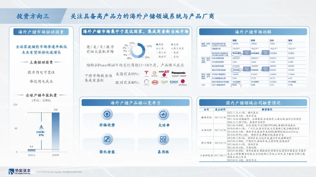 海外户储产品在电力市场化机制相对成熟的国家具备更大的市场空间,然而美国及欧洲户储项目的交付周期长,且已经形成寡头垄断的局面,影响了用户满意度;具备价格优势、安装便捷、易用性的国产储能产品将快速向海外市场渗透。
