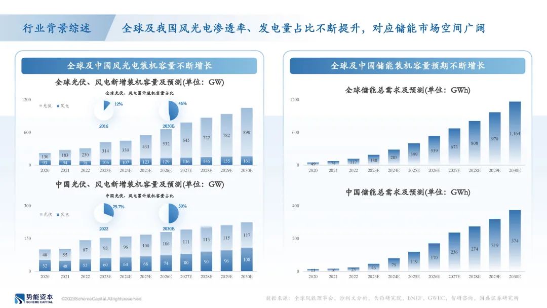 (4)从全球和中国的风光发电装机容量来看,到2030年,全球光伏装机量将达到890GW、风电装机容量将达到161GW,风光装机容量占比将达46%;中国光伏装机量将达到117GW、风电装机量将达到108GW,风光装机容量占比将达到50%。面对巨大的配储市场空间,全球和我国的储能总需求预计将分别达到1164GWh和374GWh。同时,从全球和我国的风光装机容量占比可以看出,全球光伏发电装机容量占比及增速远超风电,而我国则是风电装机容量占比增长较快;全球范围内,光伏侧配储的需求更高,我国在风电侧和光伏侧均存在广阔的配储市场空间。