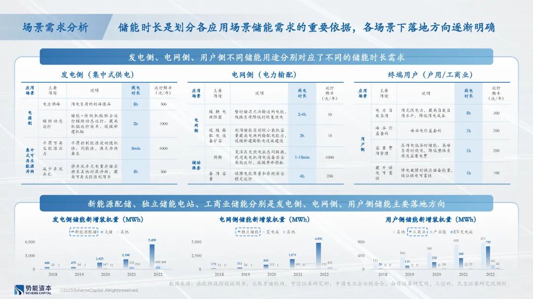 发电侧、电网侧、终端用户侧不同细分场景对于储能分别有不同的需求。例如,源网侧用于电力调峰的储能系统对于储能时长的要求更高,平滑控制能源波动随机性、间歇性及满足并网要求方面对于短时储能方案的需求更高。未来各类时长储能方案均有一定的适用场景,对应的市场空间也各不相同。