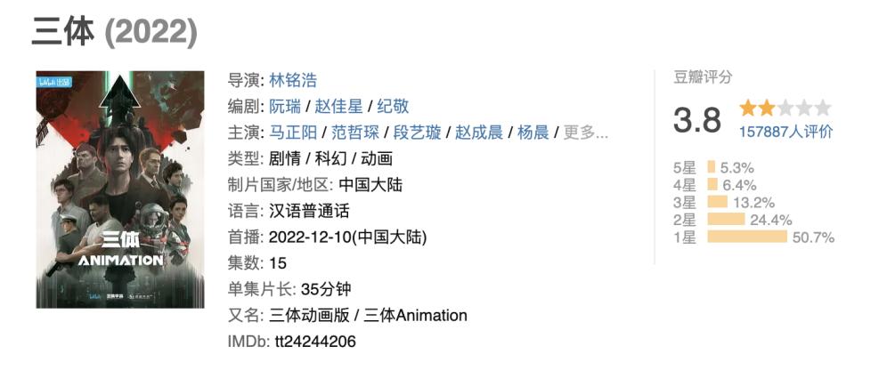需要注意的事,投资2亿的《三体》动画开播前,B站对其的预估播放量是8亿,但截止发稿该片在B站平台的播放量只有5.6亿。在豆瓣上,该片被157883人打出3.8分。