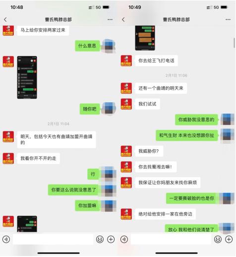 社交平台上疑似某一方曹氏鸭脖招商人员的威胁