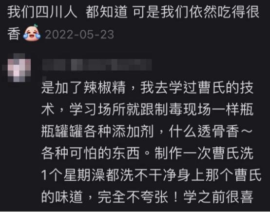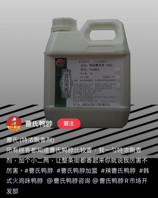 曹氏鸭脖倒也没藏着掖着,在社交平台上大方承认其餐品里使用的就是工业辣椒精。且不止工业辣椒精,增味粉、护色剂、透骨香……现场学习过曹氏鸭脖的加盟商表示“堪比制毒现场”。