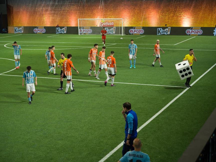 一个巨大的骰子从足球场边的看台上掷下,在球场上滚了几下之后,最终朝上的点数为2,于是双方球员各自减少至仅余两人,以2v2的方式,在比赛的最后几分钟一决胜负。