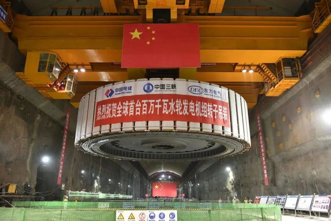 德阳研制全球首台百万千瓦水轮发电机组转子在白鹤滩水电站吊装