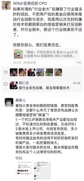 对此,极米方在朋友圈回应称,认为坚果方是在炒作、碰瓷,并强调极米科技对科技的资金投入公开透明,没什么可质疑的:"看到大家发来的截图和链接,感觉到匪夷所思:这都什么年代了竟然还有品牌公关硬要碰瓷营销“撕逼”?