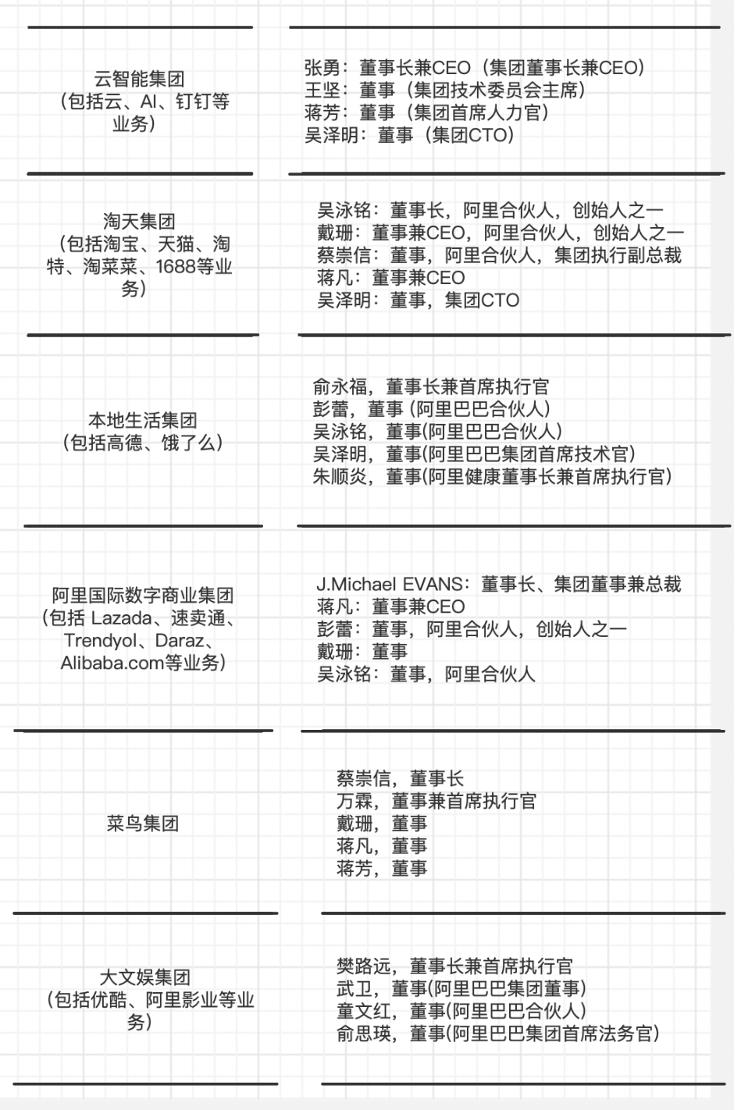 先来看具体的调整:阿里从集团拆成了阿里云智能、淘宝天猫商业、本地生活、菜鸟、国际数字商业、大文娱在内的六大业务和多家业务公司,马云之外,这次调整后十八罗汉也部分回归,分家之后各起炉灶,各自设立集团公司的董事会,实行CEO负责制,对各自的经营成果负责。集团也从过去对旗下业务各方各面的统管,转向对子公司的控股。