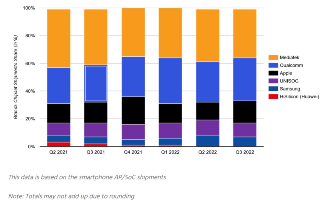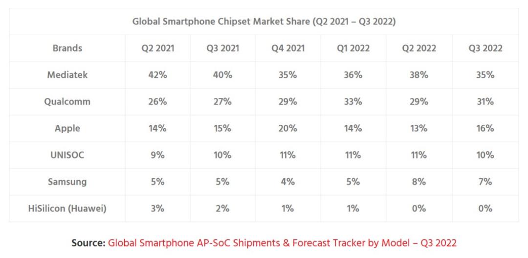 根据Counterpoint的口径,2022年第三季度,联发科和高通仍然位居全球智能手机AP/SoC市场份额前二,苹果和三星则以16%和7%艰难啃下23%的市场,海思市场份额已经清零。