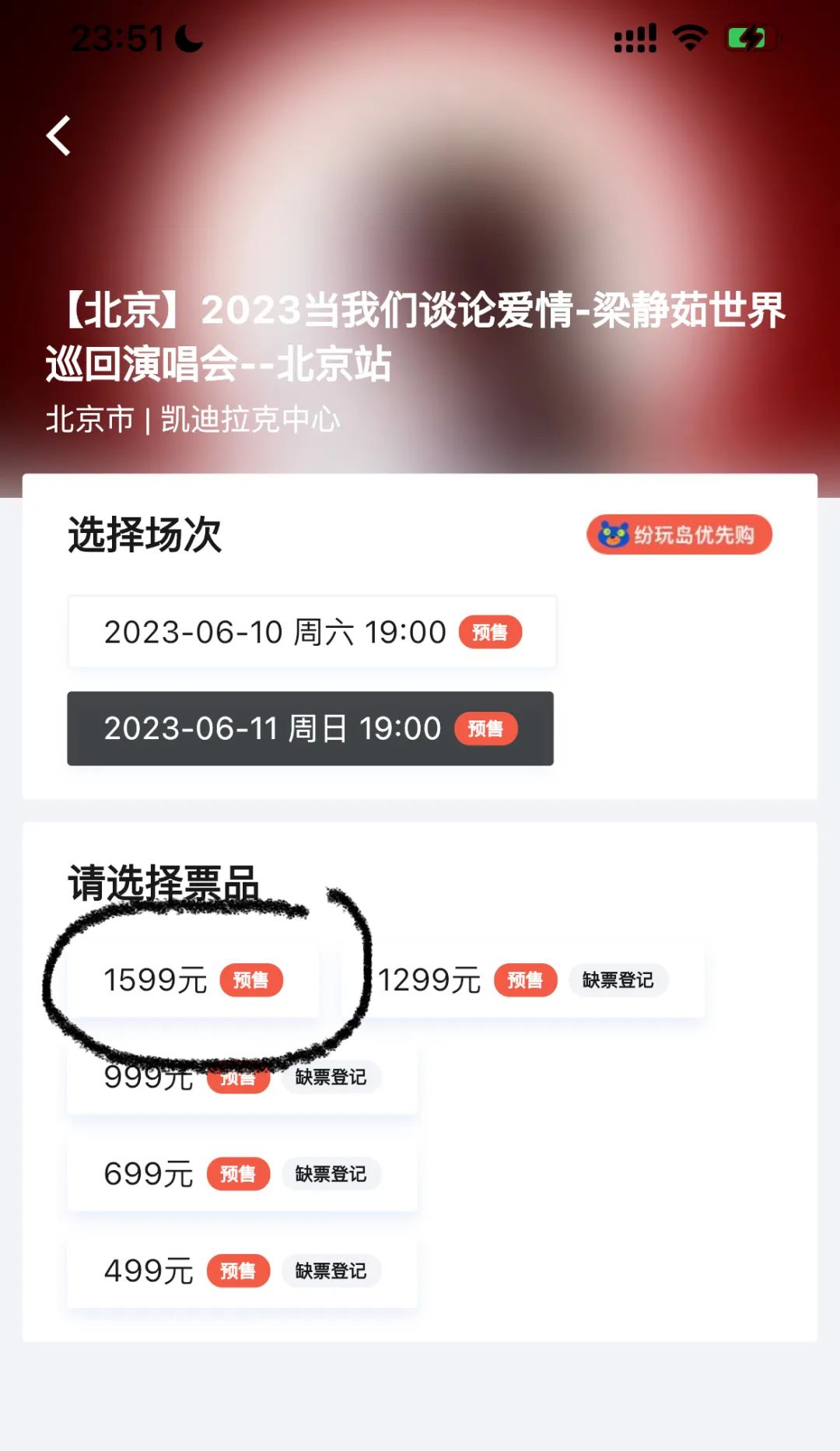 6月2日,纷玩岛在下午四点再次开启梁静茹北京场抢票,彼时不仅有各个区间的票价掉落,当晚零点左右,依然有1599元票价的位置空出。少了黄牛的参与,演唱会门票抢起来反而容易不少。