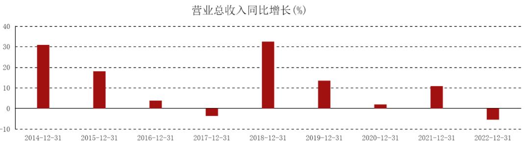 梳理历年财报可知,2014至2022年,上海银行的营业总收入规模虽然整体呈现增长态势,但增速表现令人担忧。2014-2017年与2018-2022年这两个期间,营收增速出现了逐年急速递减的情况,2017年和2022年更是营收增速为负。2022年,上海银行营收为531.1亿元,同比增速为-5.54%。