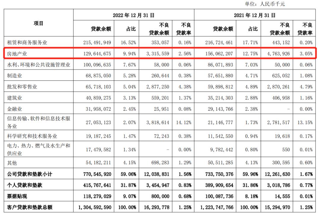 虽然占比较2021年的12.75%下降了2.81个百分点,但是这个千亿量级在城商行中遥遥领先,只有同样高房价的北京银行也在这一指标上突破了千亿元,而多数城商行贷款金额仅为百亿级,比如江苏银行同期的房地产业贷款余额为892.97亿元,宁波银行的则为842.31亿元。